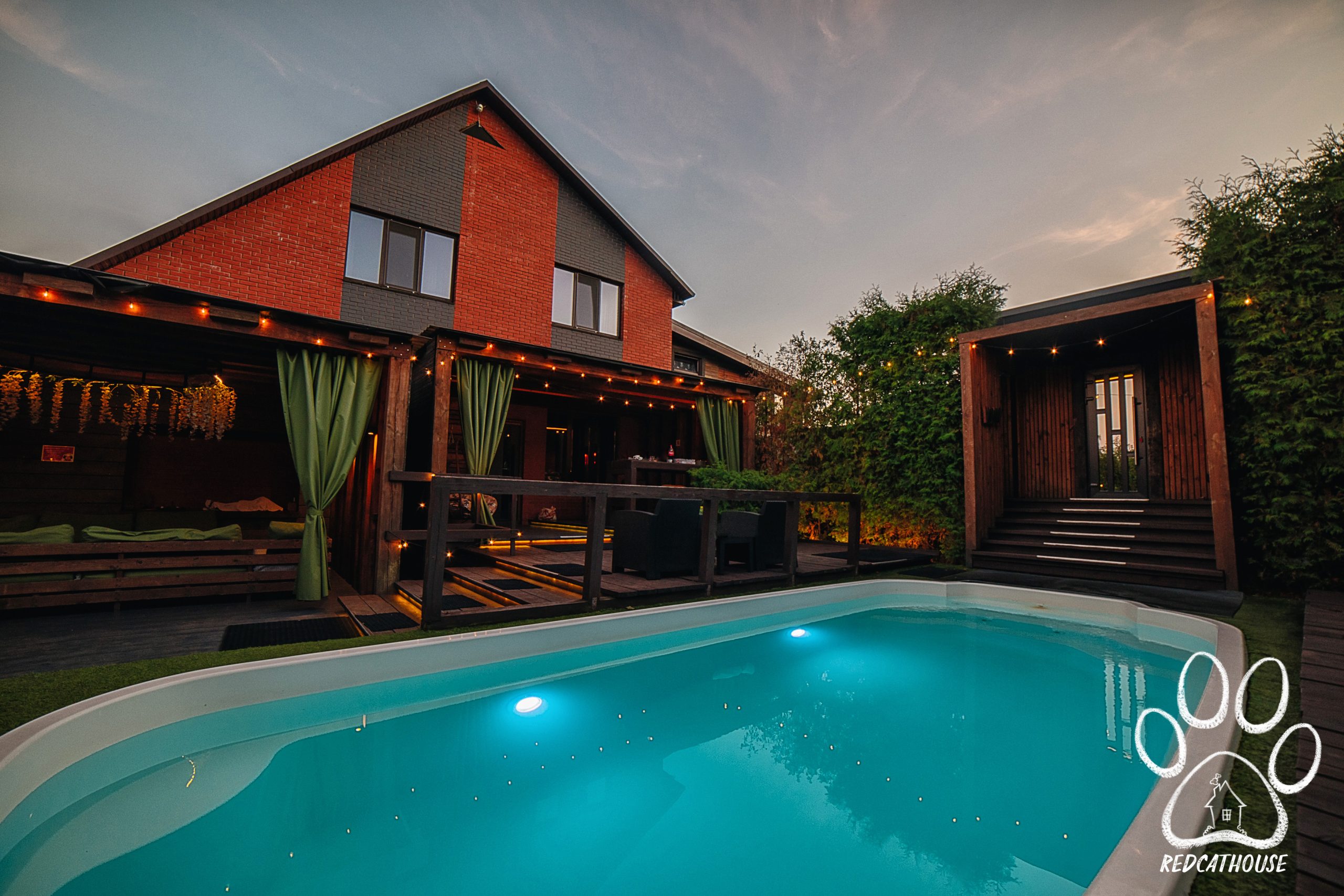 Возле каждого дома есть свой бассейн: дом Greenmoon — уникальный бассейн инфинити с подогревом (работает круглый год), красный дом — бассейн с подогревом (работает круглый год), деревянный дом — каркасный бассейн (работает в летний период).