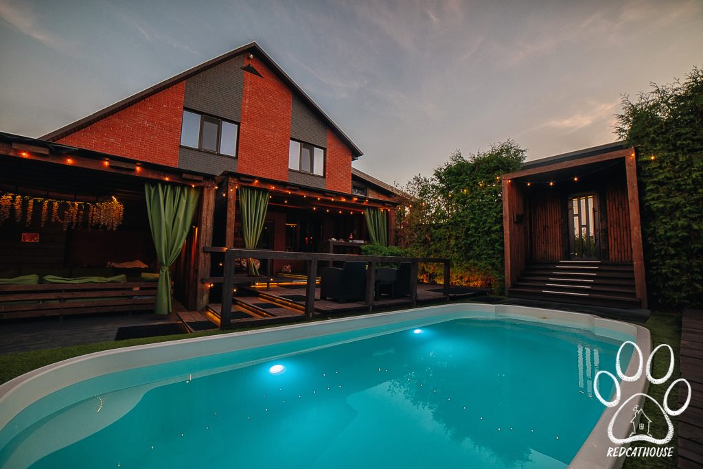 На территории красного дома расположены бассейн с подогревом, который работает круглый год, русская баня на дровах, джакузи под открытым небом (баня и джакузи оплачиваются отдельно), крытая беседка с BBQ-комплексом, кострище, парковка на 5-6 машиномест.