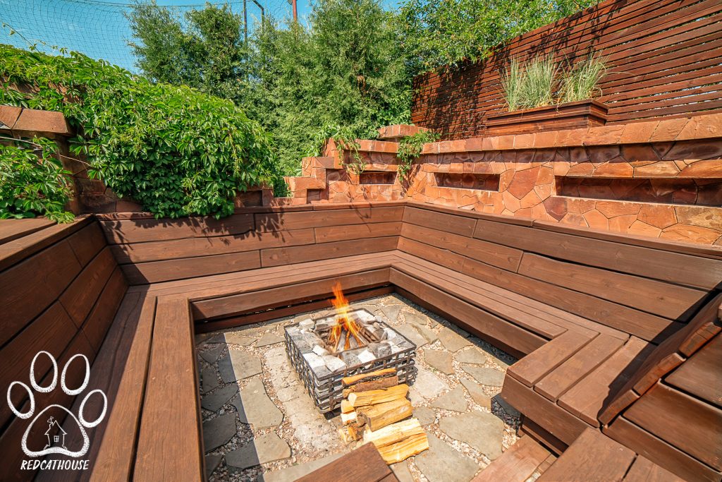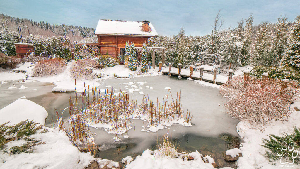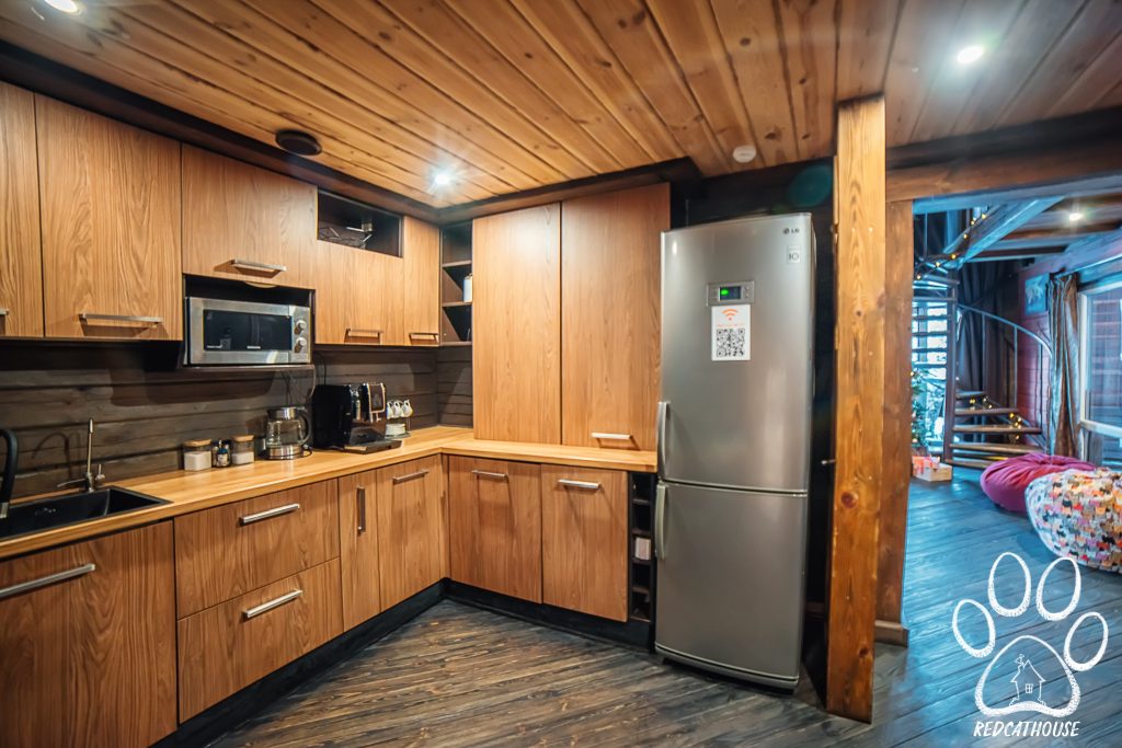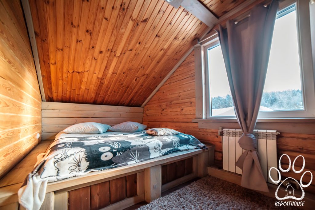 Внутри Деревянного дома тепло и сказочно: пламя камина, деревянная отделка, окна «в пол», расположиться можно прямо на полу и на специально обустроенных местах с мягкими подушками. И, конечно, рядом с Вами сядет он — пушистый рыжий кот.